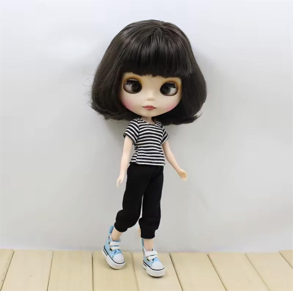 دمية أنيقة ومميزة بتصميم عصري، تتمتع بشعر أسود قصير ومموج مع غرة أمامية، مما يمنحها مظهرًا كلاسيكيًا وجذابًا. تتميز بجسم مفصلي بالكامل يتيح إمكانية تحريك الأطراف بسهولة، مما يجعلها مثالية للعب أو العرض.